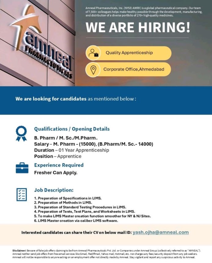Amneal Pharmaceuticals hiring Apprentice for Quality department || Apply now